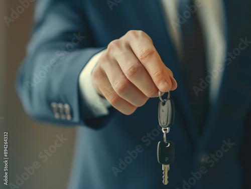 Business professional holding a set of keys to a property, symbolizing the completion of a real estate transaction.