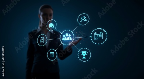 Business Professional Interacting with Advanced Virtual Interface System Featuring Holographic Business Process Visualization