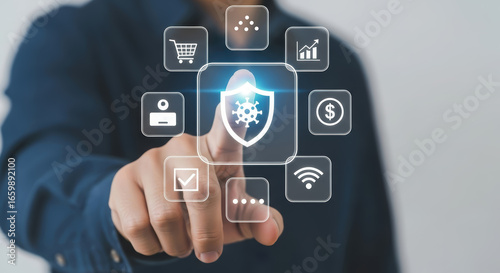 Business professional interacting with digital security icons on a touchscreen, showcasing cybersecurity concepts and technology in a modern workspace environment with a focus on data protection