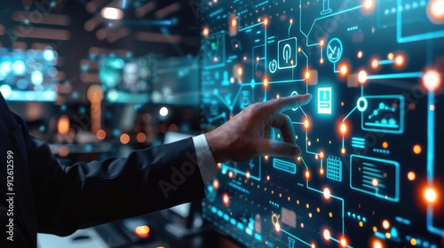Business Professional Interacting with Futuristic Digital Interface in High-Tech Office Environment