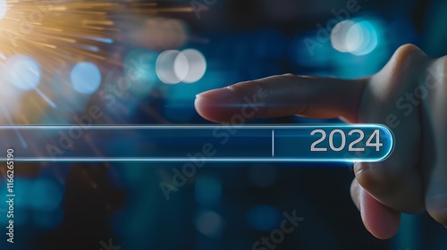 Business professional pointing to a digital loading bar transitioning from "2024" to "2025," symbolizing progress and business growth.
