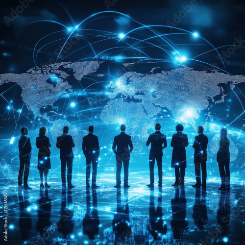Business professionals analyzing global connectivity and technology trends with a digital world map backdrop
