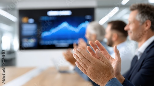 Business professionals applaud in a modern office with a stock market graph displayed on a screen in the background.