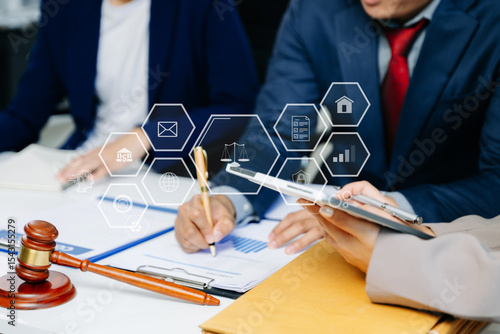 Business professionals discussing contracts, signing papers, and using digital devices in a modern office.