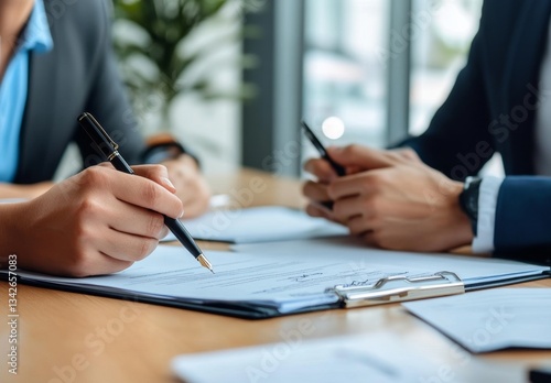 Business professionals engaged in discussion and signing documents in a modern office setting with natural light and greenery in the background