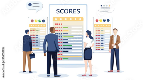 Business professionals reviewing scores on a large display with colorful data visualization shown here