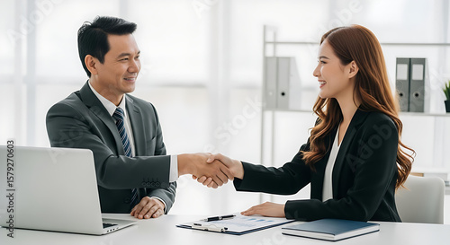 Business professionals shake hands in a bright office, signifying partnership and success, ready to tackle new business challenges.