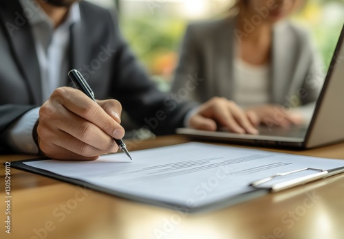 Business Professionals Signing Document and Working on Laptop