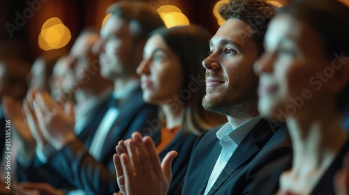 Business seminar attendees clapping as they watch a live demonstration of a new technology