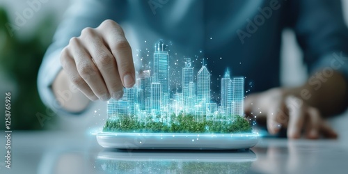 business startup with expansion. A person interacting with a digital model of a green cityscape on a smartphone.