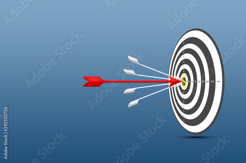 business strategy concept background red arrow stuck through white arrow target on center dart board. creative design leadership.