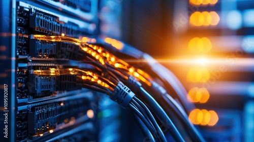business strategy operations scalability concept. A close-up view of network cables connected to servers, highlighting the glowing connections in a data center environment.