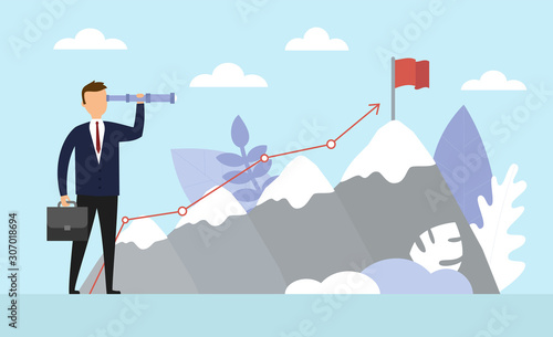 Business Success concept. Businessman is standing and watching the telescope for growth modern ideas and to achieve higher goals. Cartoon, illustration of sky with cloud and mountain. Vector.