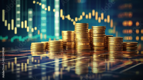 Business success concept wealth stock investment.Business in the digital age.Double exposure of graph and stacks of gold coins.