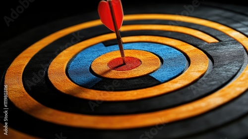 Business target achievement with dart on colorful bullseye representing KPIs performance metrics for strategic planning and success measurement
