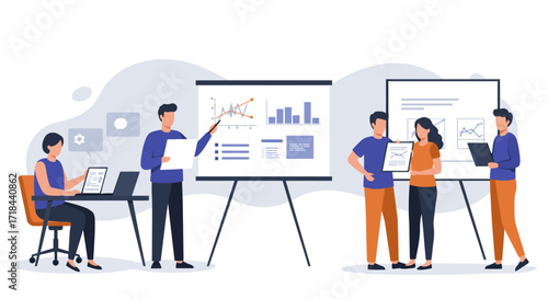 Business team analyzing data charts in a meeting strategizing for growth and innovation in a modern office environment for marketing presentations