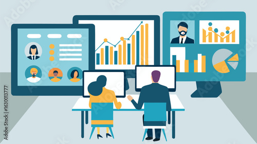 Business team analyzing data on multiple screens in a virtual meeting environment for collaboration