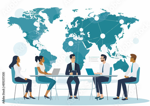 Business Team Discussing Global Trade Strategies in Front of World Map, Vector Illustration, Collaborative Global Investing, Concepts of International Teamwork and Trade Policies