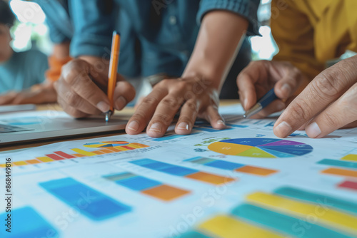 Business team having a meeting to analyze data graph charts for a marketing plan in the office.