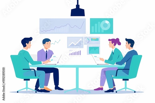 Business Team Meeting: A diverse team collaborates around a table, laptops and data charts visible, illustrating a productive and collaborative work environment.