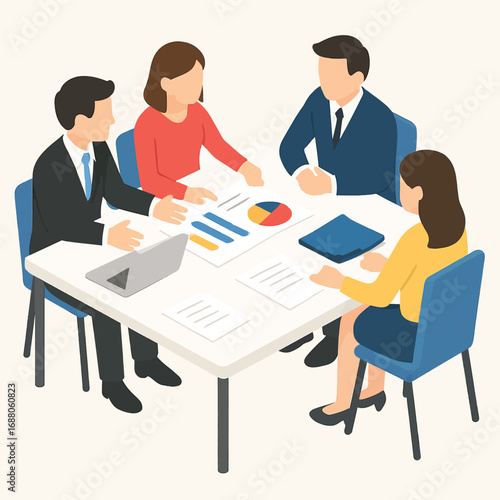 Business Team Meeting: Illustrative business team members engaging in a strategic meeting, collaborating around a table filled with data charts, and a laptop.