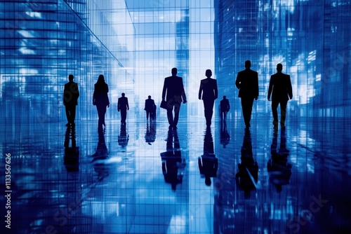 Business team silhouette, business network connection, and digital technology concept with double exposure of a group of people working together in an office on a blue background Generative AI