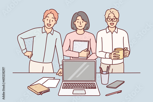 Business team smiling standing near desk with laptop in office and reporting to manager on work done