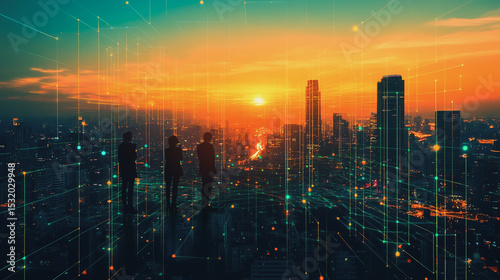 business team stands on the peak of success amid tall innovative Smart city with connection network reciprocity over the cityscape social media networking systems that connects on the peak of succes
