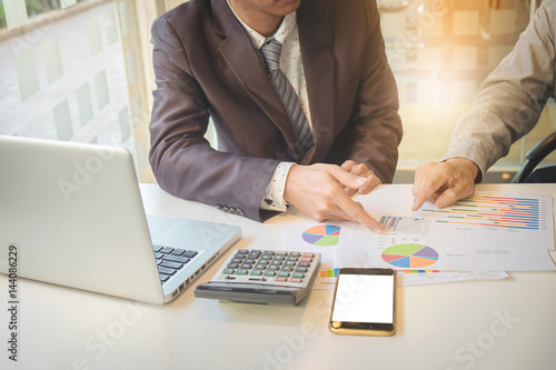 Business team two colleagues discussing new plan financial graph data on office table with laptop and digital tablet.