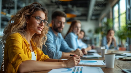 Business team working on a project in the office behind a table or reviewing and discussing a business project. IT workers in the office. Team concept. Work concept. Leaders concept.Business concept