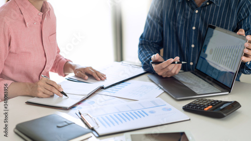 Business team working with plan on office desk with new startup project analyzing financial document data charts and graphs in Meeting and successful teamwork Concept.
