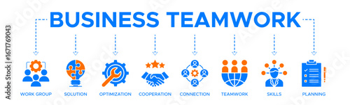 Business teamwork banner web icon vector illustration concept with icon of work group, solution, optimization, cooperation, connection, teamwork, skills, planning