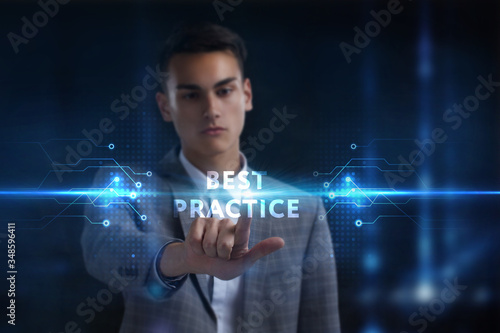 Business, Technology, Internet and network concept. Young businessman working on a virtual screen of the future and sees the inscription: Best practice