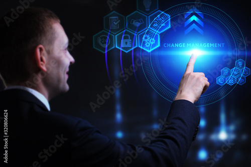 Business, Technology, Internet and network concept. Young businessman working on a virtual screen of the future and sees the inscription: Change management
