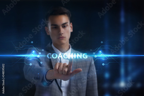 Business, Technology, Internet and network concept. Young businessman working on a virtual screen of the future and sees the inscription: Coaching