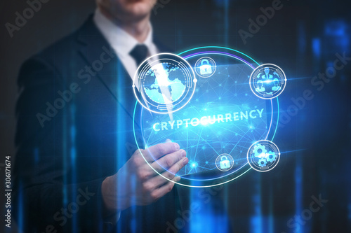 Business, Technology, Internet and network concept. Young businessman working on a virtual screen of the future and sees the inscription: Cryptocurrency