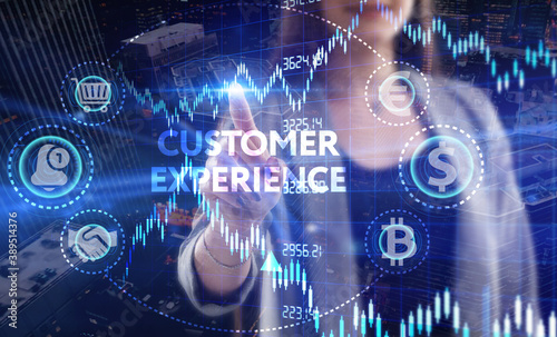 Business, Technology, Internet and network concept. Young businessman working on a virtual screen of the future and sees the inscription: Customer experience
