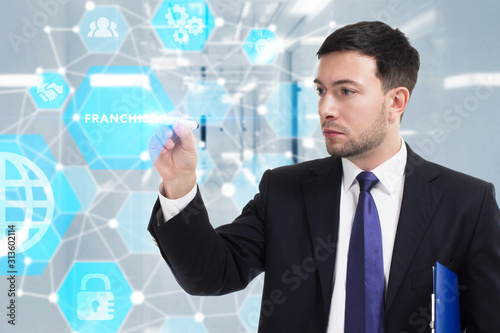 Business, Technology, Internet and network concept. Young businessman working on a virtual screen of the future and sees the inscription: Franchise
