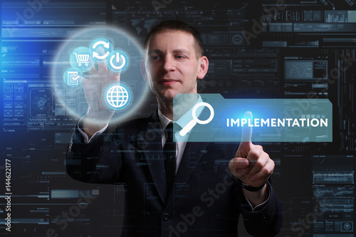 Business, Technology, Internet and network concept. Young businessman working on a virtual screen of the future and sees the inscription: Implementation
