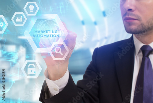 Business, Technology, Internet and network concept. Young businessman working on a virtual screen of the future and sees the inscription: Marketing automation
