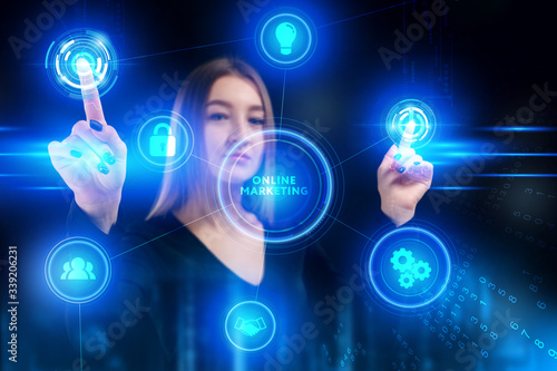 Business, Technology, Internet and network concept. Young businessman working on a virtual screen of the future and sees the inscription: Online marketing