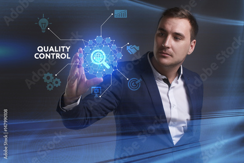 Business, Technology, Internet and network concept. Young businessman working on a virtual screen of the future and sees the inscription: Quality control