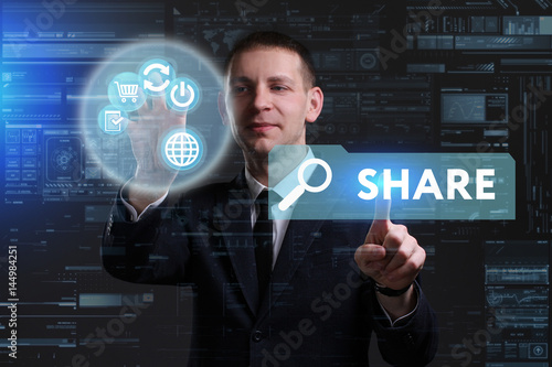 Business, Technology, Internet and network concept. Young businessman working on a virtual screen of the future and sees the inscription: Share