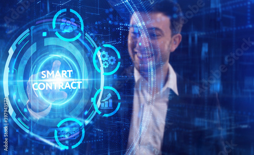 Business, Technology, Internet and network concept. Young businessman working on a virtual screen of the future and sees the inscription: Smart contract