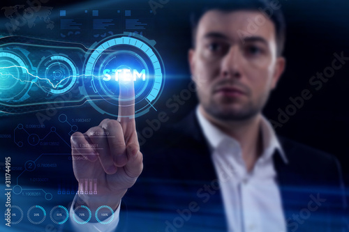 Business, Technology, Internet and network concept. Young businessman working on a virtual screen of the future and sees the inscription: STEM