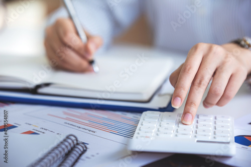 business woman or accountant who are using a calculator to calculate business data Accounting documents and laptop computer at the office business idea