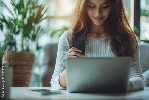 Business woman sitting at office table using mobile phone while online working on laptop computer at home office, business casual, telecommuting, working from home, close, Generative AI