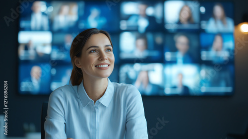 business woman smiles during video conference, surrounded by multiple screens displaying participants. atmosphere is professional and engaging, highlighting modern communication