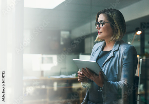 Business woman, thinking and tablet with ideas, plan or deadline as project manager in web agency for communication. Female person, app and working on tech for connection as professional for company