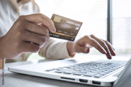 Business woman using laptop and holding credit card for paying detail page display online shopping purchase and entry security code to inputting card information